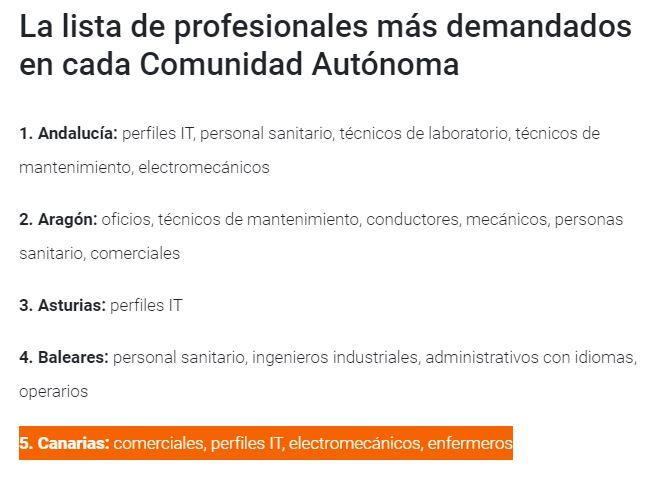 En Este listado aparece Canarias en el número 5, con las profesiones más demandadas: Comerciales, perfiles IT, electromecánicos, enfermeros.